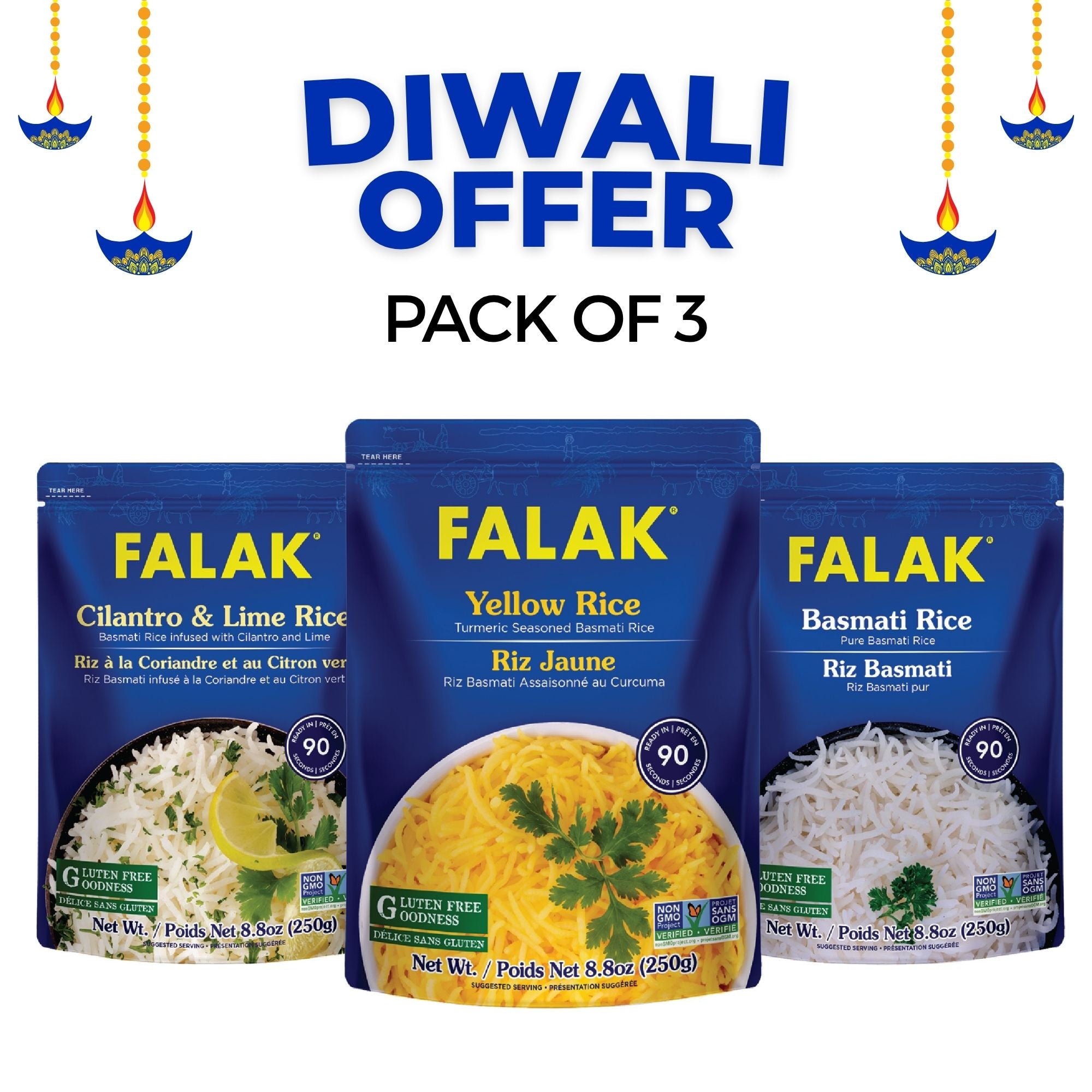 Enjoy authentic, fluffy long-grain Basmati rice anytime, anywhere with the FALAK Ready-to-Eat Variety Pack — featuring three delicious flavors: