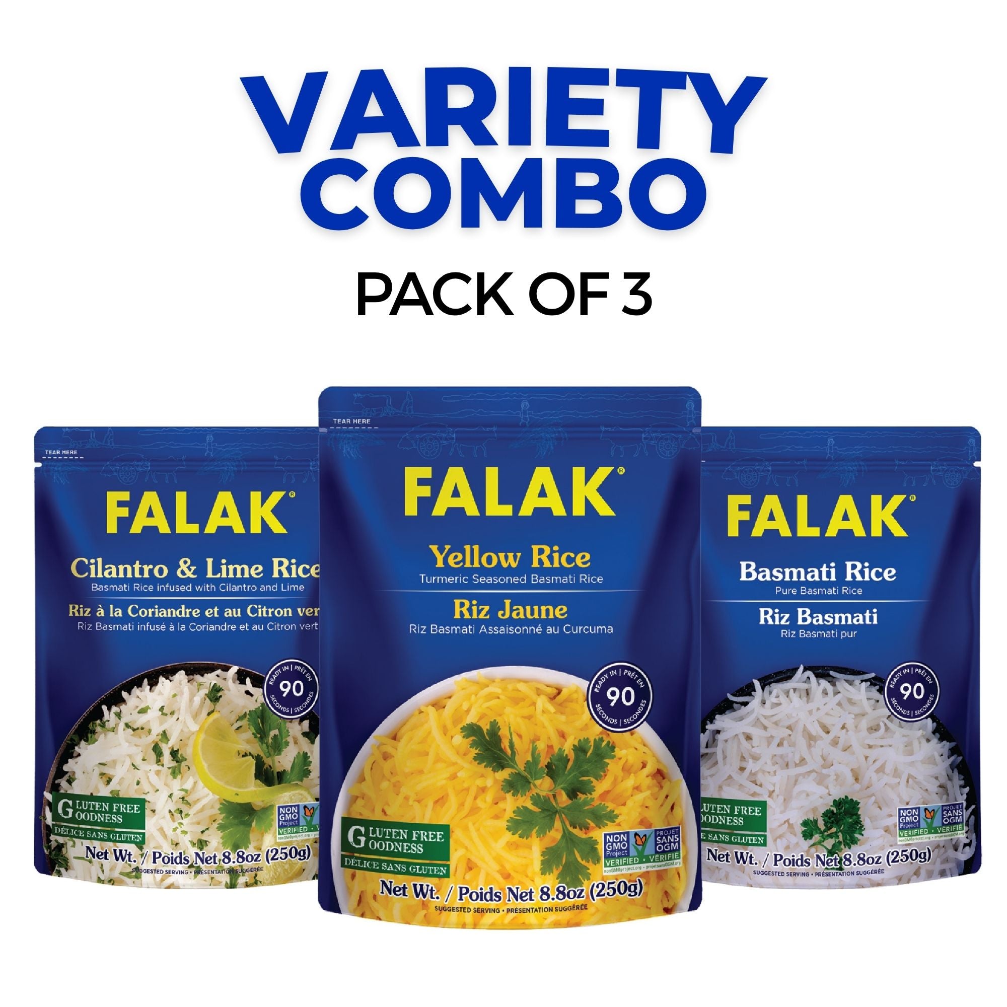 Enjoy authentic, fluffy long-grain Basmati rice anytime, anywhere with the FALAK Ready-to-Eat Variety Pack — featuring three delicious flavors: